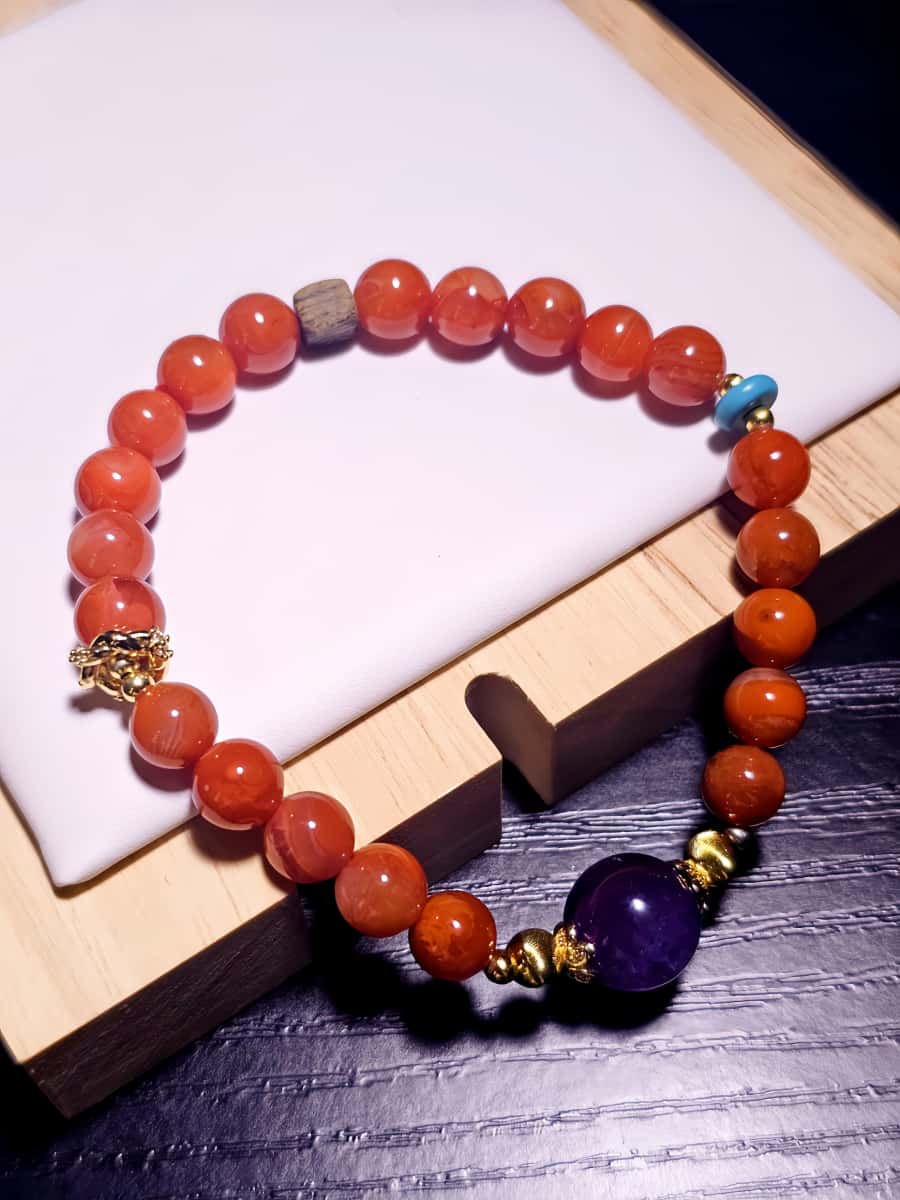 Armband aus natürlichen südroten Achatperlen, kombiniert mit einem stabilisierten Lepidolith-Fokalstein. Ergänzt durch vergoldete Kupferelemente, Dalakan-Agarholz und Türkisakzente. Elegantes und warmes Design – ideal zum täglichen Tragen oder Sammeln. | Armbänder, Armreifen ⋅ Naturstein Schmuck ⋅ Perlenarmbänder | ||