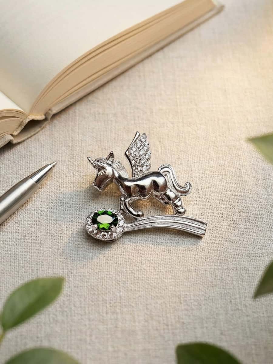 Der Damen Halsanhänger Silber Einhorn verbindet ein modernes Einhorn-Meteor-Design mit grünem Diopsid und funkelnden Zirkonia. Ein elegantes Schmuckstück voller Symbolkraft und Leichtigkeit. | Halsketten, Charm, Anhänger ⋅ Silberschmuck ⋅ Silber Anhänger | ||
