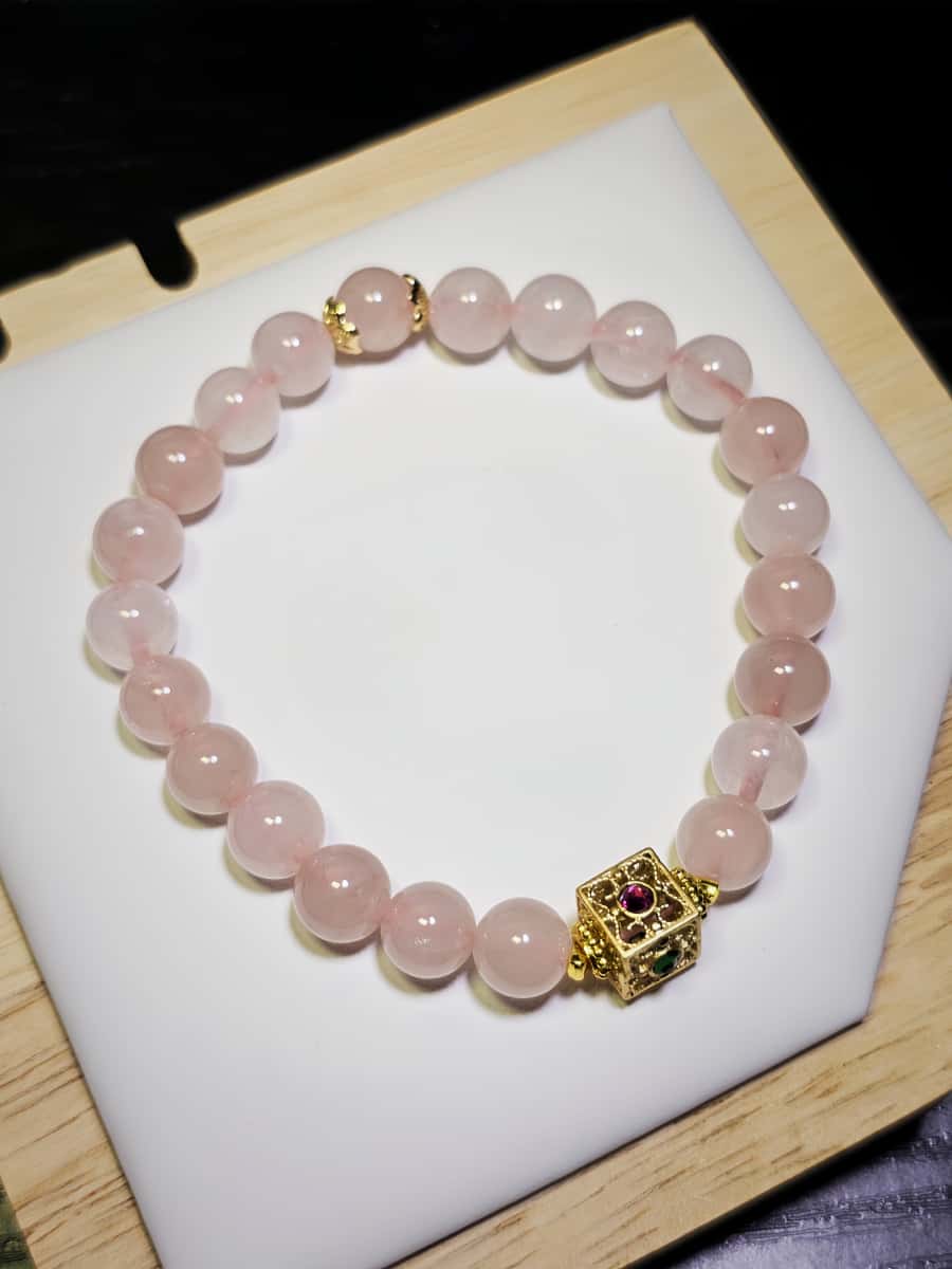Dieses Damenarmband mit Rosenquarz Naturstein verbindet natürliche Eleganz mit zeitloser Schlichtheit. Sanft rosafarbene Edelsteinperlen aus echtem Rosenquarz werden durch ein vergoldetes Detail harmonisch ergänzt und machen das Armband zu einem stilvollen Begleiter für jeden Tag. | Armbänder, Armreifen ⋅ Naturstein Schmuck ⋅ Perlenarmbänder | ||