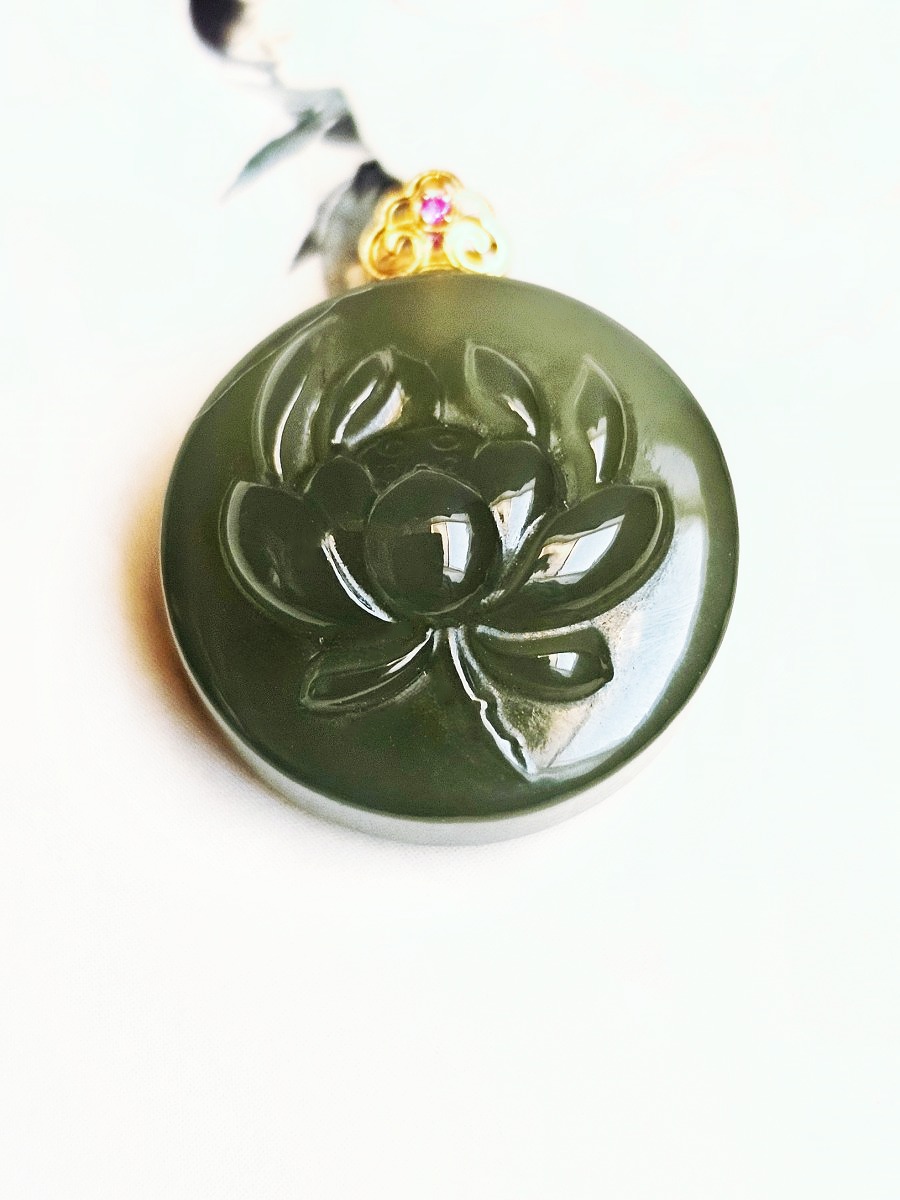 Elegantes Damen Halsanhänger mit Lotus Symbol aus Jade Medaillon mit fein geschnitzter Lotusblüte. Naturalgrüner Jade-Ton, polierte Oberfläche und vergoldete Silberöse. Zeitloser Symbolschmuck für Alltag und besondere Anlässe. Glücksanhänger mit Lotus SymbolDieser runde Lotus Anhänger steht für innere Balance und einen ruhigen Neuanfang. Als Glücksschmuck getragen, erinnert er daran, auch in bewegten Zeiten bei sich zu bleiben. Ein zeitloses Design für Frauen, die Wert auf Bedeutung, Qualität und Zurückhaltung legen. | Halsketten, Charm, Anhänger ⋅ Silberschmuck ⋅ Naturstein-Anhänger | ||