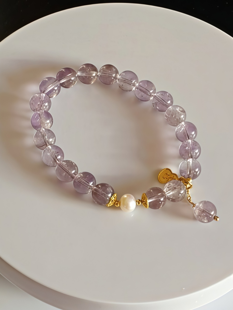 Elegantes Armband aus natürlichem Amethyst, kombiniert mit einer echten Perle und vergoldeten Details.