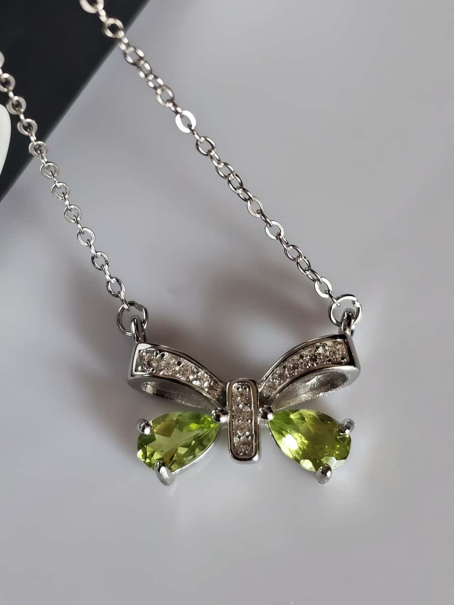 Elegante 925er Silber Halskette mit romantischem schleife-Design, auf beiden Seiten mit funkelnden natürlichen Olivinen besetzt. Perfekt für Alltag, Büro oder als Geschenk. | Halsketten, Charm, Anhänger ⋅ Silberschmuck ⋅ Silber Halsketten | ||