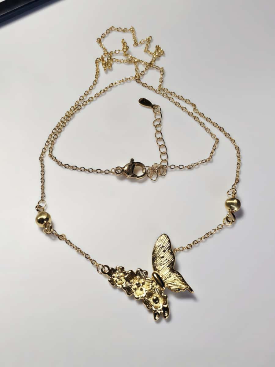 Diese vergoldete Damenhalskette verbindet feminine Eleganz mit modernem Design. Der kunstvolle Anhänger ist ein echter Blickfang: Er kombiniert einen filigranen Blumenflügel mit einem fein modellierten Schmetterlingsflügel. Die hochwertige Vergoldung auf Kupfer verleiht dem Schmuckstück einen warmen, weichen Glanz. | Halsketten, Charm, Anhänger ⋅ Trendige Design Halsketten | ||
