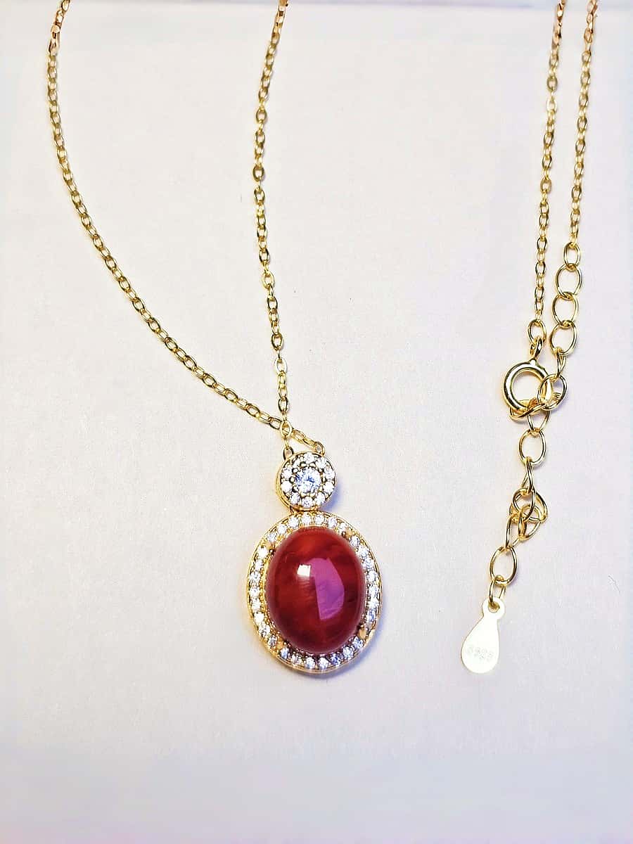 Elegante Damen Halskette mit tiefrotem Nanhong-Achat. Flammenartige Maserung, Zirkonia-Fassung und vergoldetes Silber. Zeitlos, feminin und hochwertig. | Halsketten, Charm, Anhänger ⋅ Silber Halsketten | ||